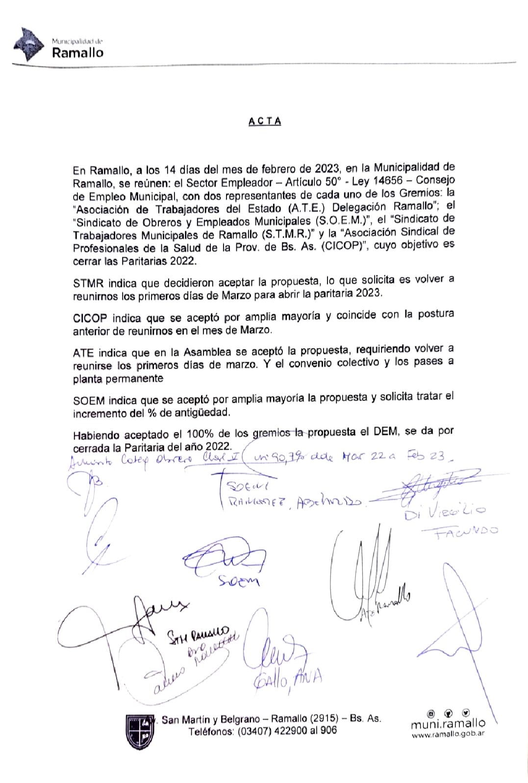 LOS GREMIOS ACEPTARON LA PROPUESTA DEL MUNICIPIO Y SE DIO POR CERRADA LA PARITARIA 2022