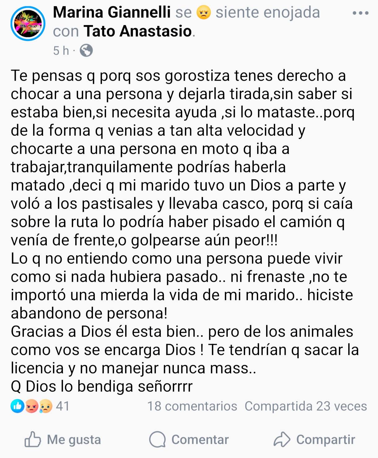 Este sábado trascendió a través de las redes sociales un episodio narrado en su cuenta de Facebook por la propia mujer de la víctima de un accidente de tránsito, un hombre empleado de la empresa Bunge que en su moto se dirigía -como todos los días- para cumplir con la jornada laboral hasta que fue víctima de un accidente cuando lo chocó un automóvil y lo tiró al suelo. Si bien no hubo riesgo de vida o lesiones graves, pudo ser una desgracia, afortunadamente no pasó a mayores ya que el cuerpo impactó contra el pasto y no la cinta asfáltica de la ruta de la Costa, pudo ser fatal.