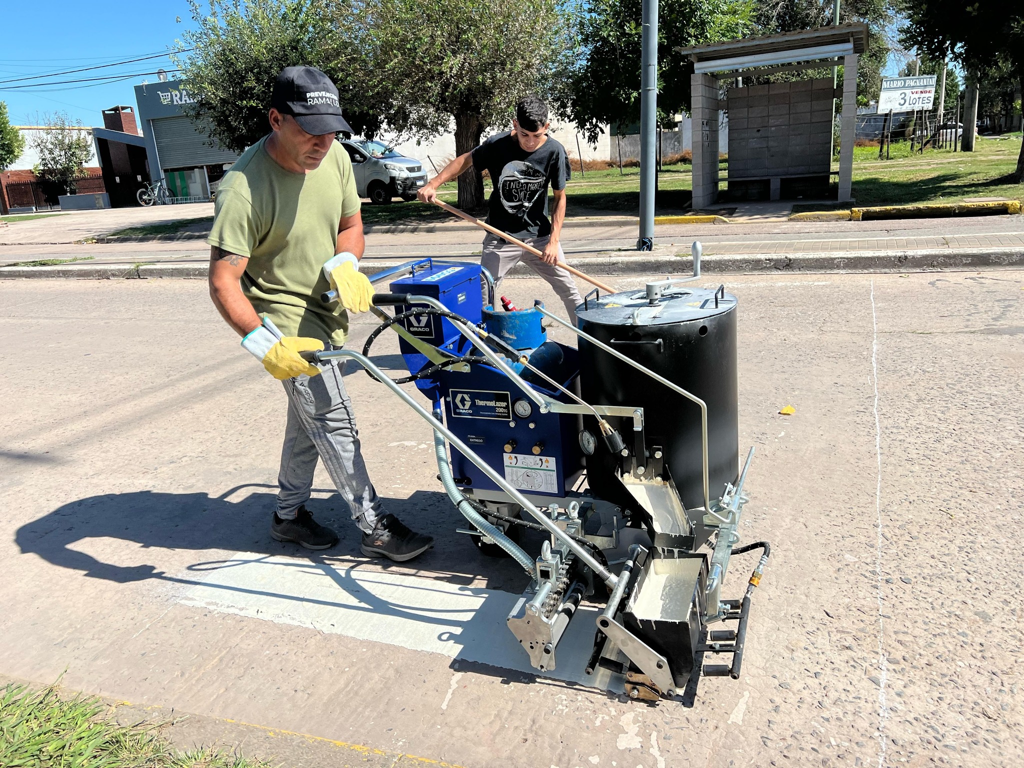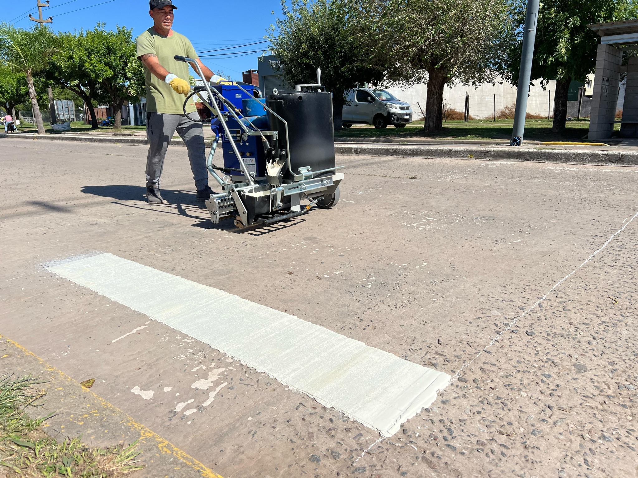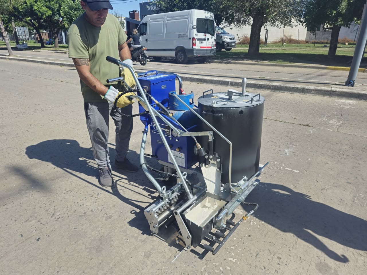 El trabajo se realiza con una pintura más duradera que las anteriores, ya que es un material termoplástico que al entrar en contacto con la temperatura de la máquina que se utiliza para el pintado, se derrite y permite que eso haga una cinta asfáltica.