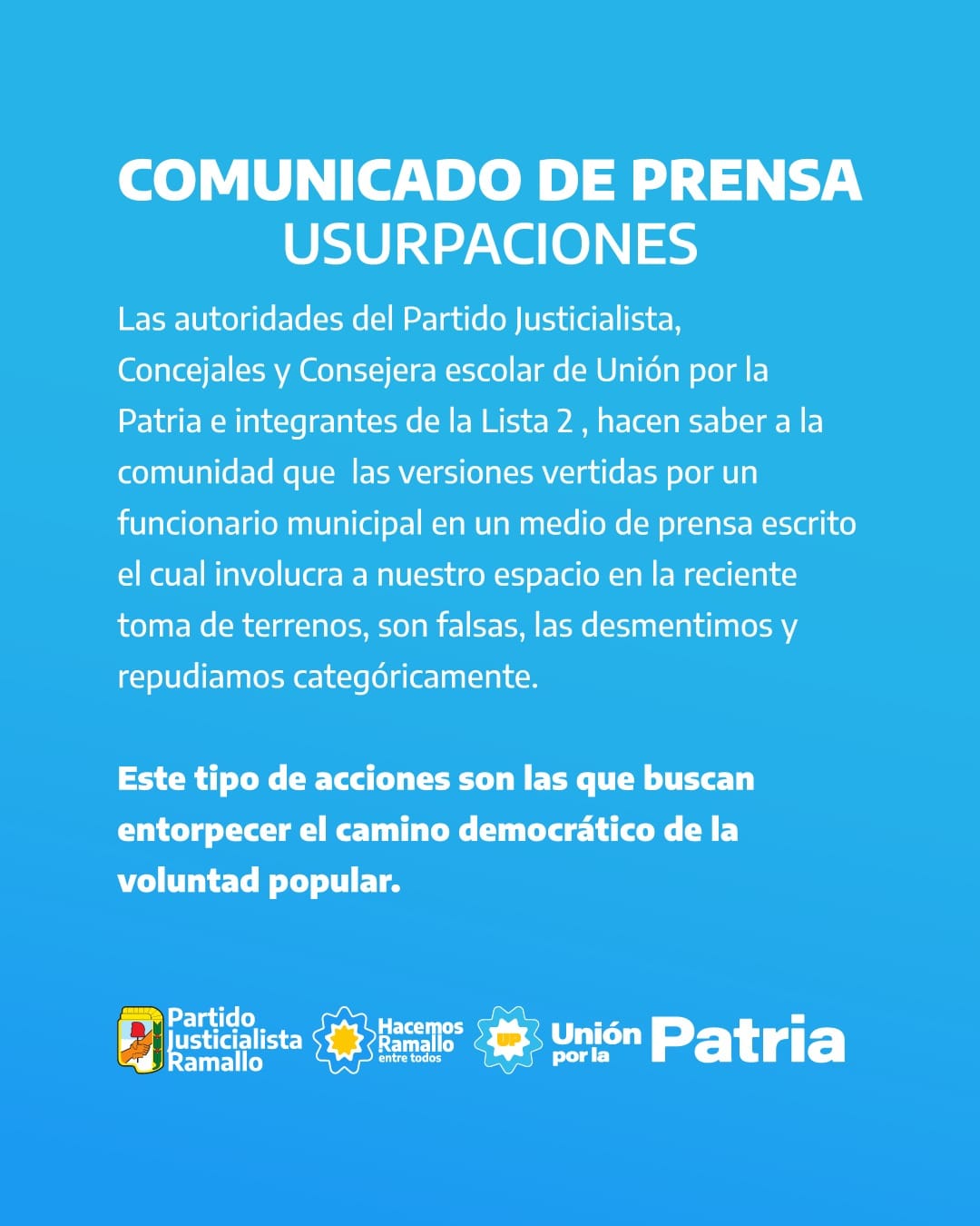 Las autoridades del Partido Justicialista, concejales y consejera escolar de Unión por la Patria e integrantes de la Lista 2, hacen saber a la comunidad que las versiones vertidas por un funcionario municipal en un medio de prensa escrito el cual involucra a nuestro espacio en la reciente toma de terrenos son falsas, las desmentimos y repudiamos categóricamente.